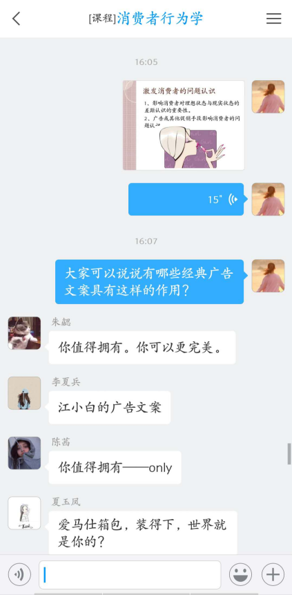 目前,通过积极拓展教学空间、引导员工开展形式多样的混合学习,确保每一节在线课堂的高质量、高互动、高水准,取得了良好的效果。员工们能够做到诚信打卡、积极互动、认真作业,统计数据显示员工学习积极性高、热情主动、参与度极高,消费者行为学基本概念和理论掌握很好,能够结合实际活学活用进行分析,达到了预期教学效果。