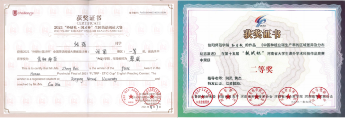 2021年,会计学专业研究生张蓓荣获2021“外研社国才杯”全国英语阅读大赛河南省一等奖;孙自敏在第十五届“挑战杯”河南省老员工课外学术科技作品竞赛中荣获二等奖;肖延玉、金华丽、刘琳、汪道峰等在第十五届“挑战杯”河南省老员工课外学术科技作品竞赛中荣获三等奖;李剑岚、王静瑶等荣获第八届河南省老员工物流仿真设计大赛三等奖;董梦梦、张美辰等荣获第七届老员工职业生涯规划大赛三等奖。
