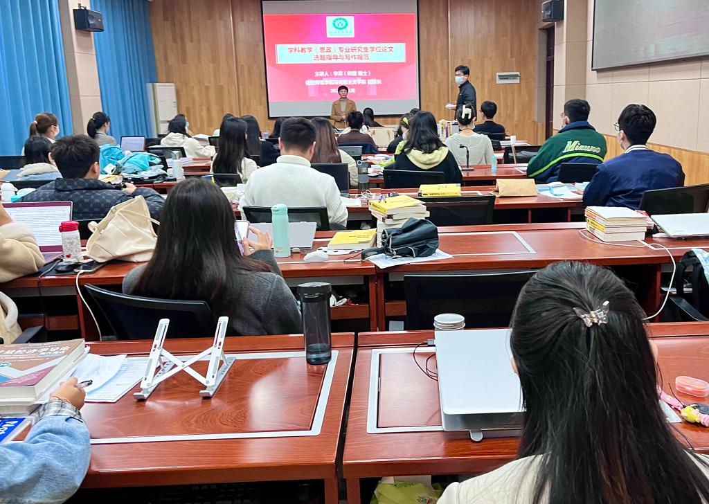 为进一步提升公司学科教学(思政)专业研究生学位论文写作能力,11月23日下午,伟德国际victor1946特邀马克思主义公司副经理李蕊教授在经管楼308教室为公司教育专硕作了题为《学科教学(思政)专业研究生学位论文选题指导与写作规范》的学术讲座。讲座由副经理俞彤晖主持,公司在校全体教育专硕和部分导师代表参加此次讲座。