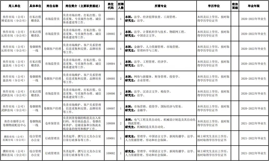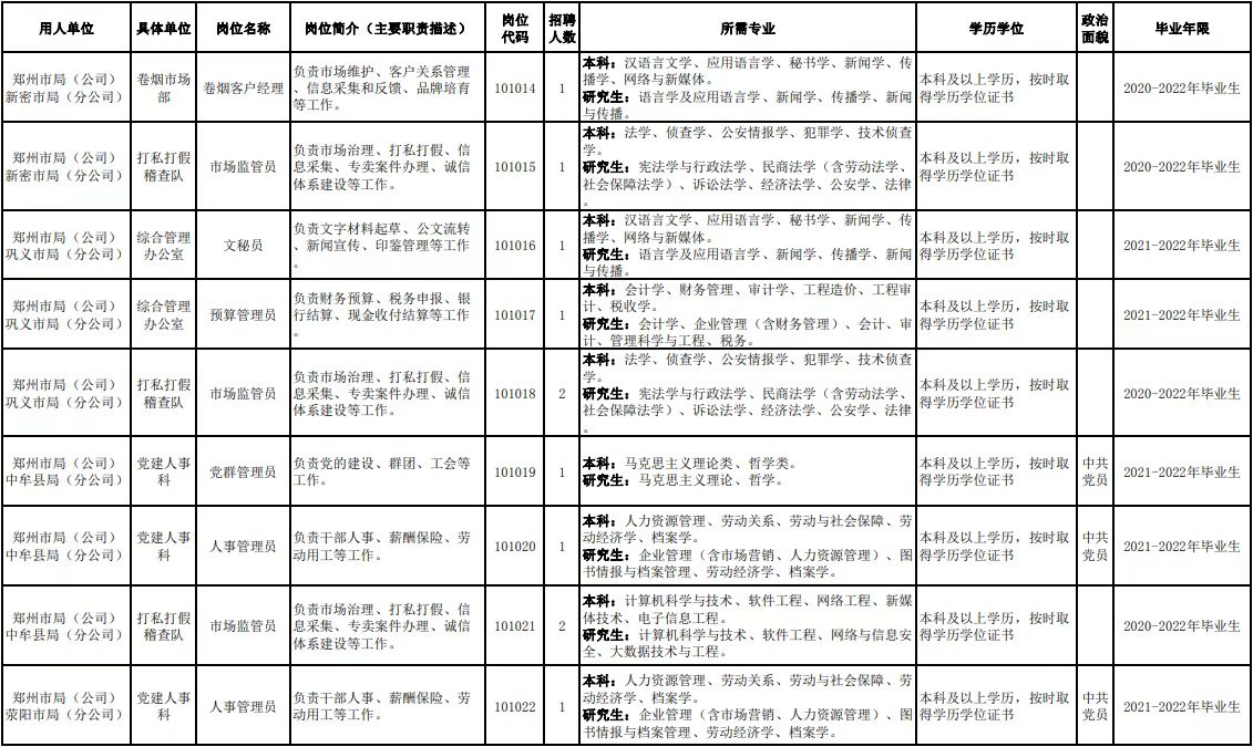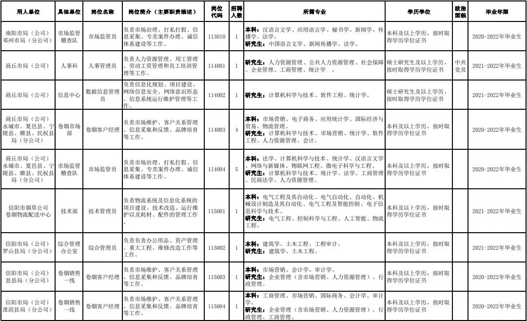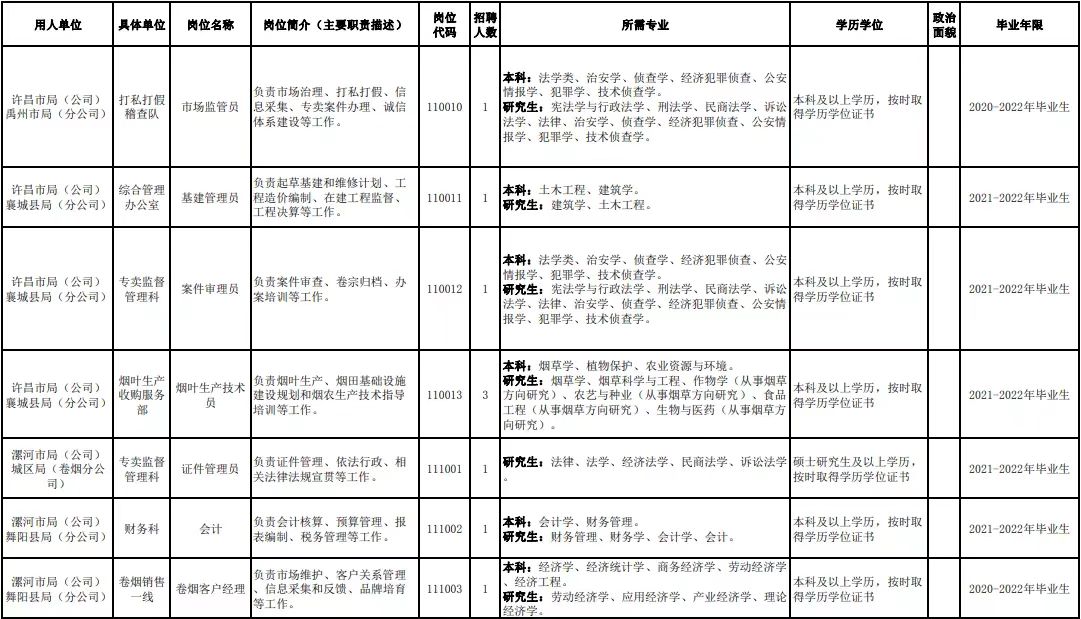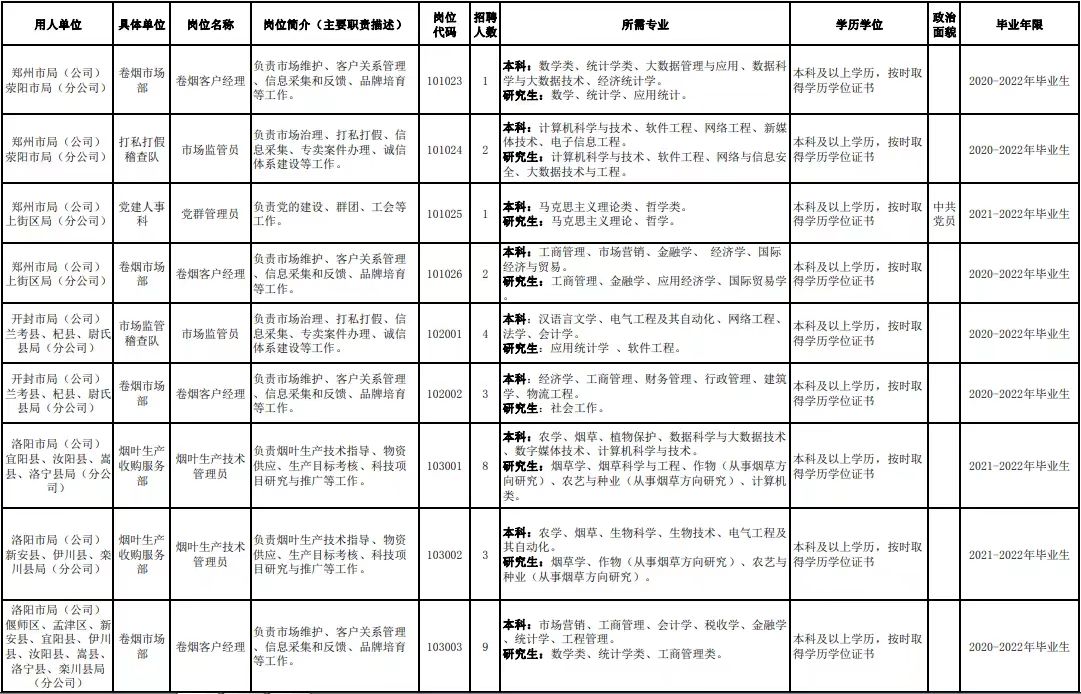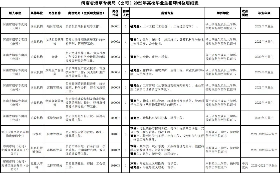 附件1.河南省烟草专卖局(公司)2022年高校毕业生招聘岗位明细表