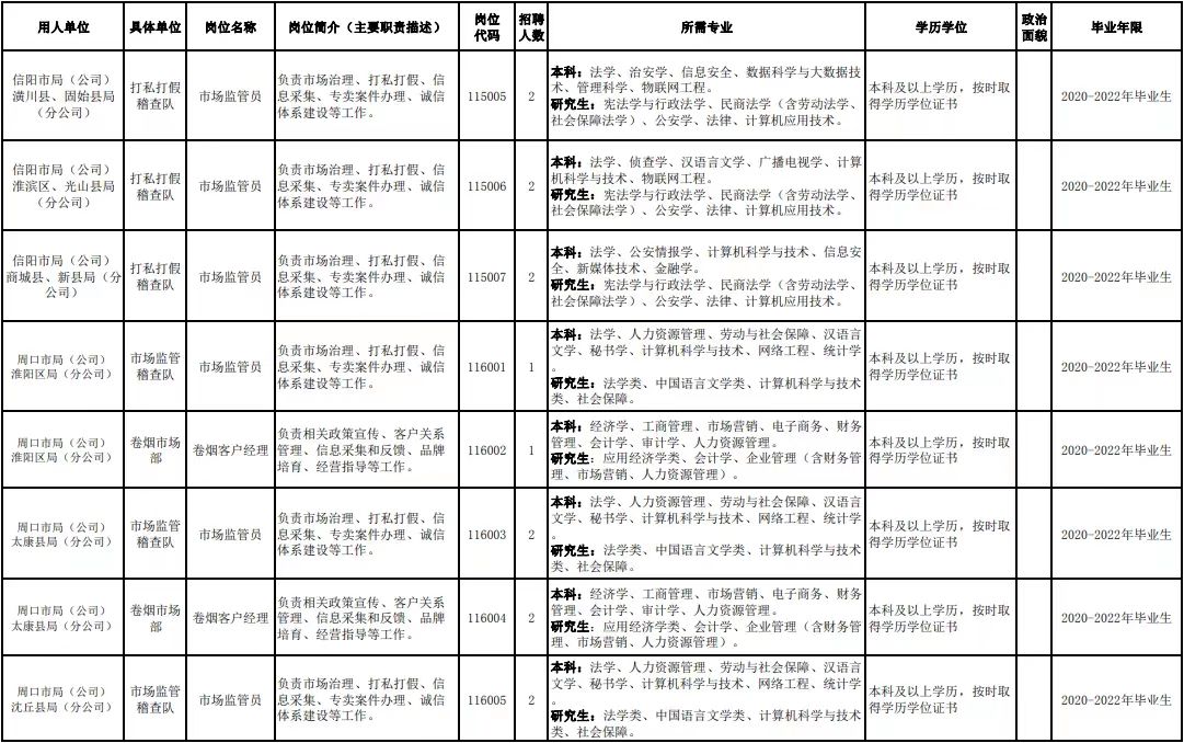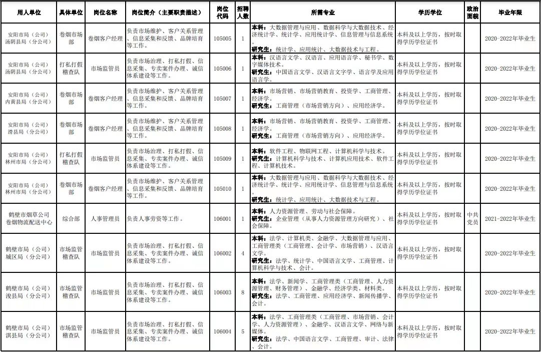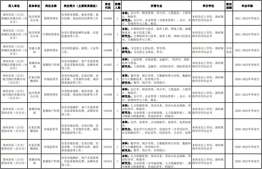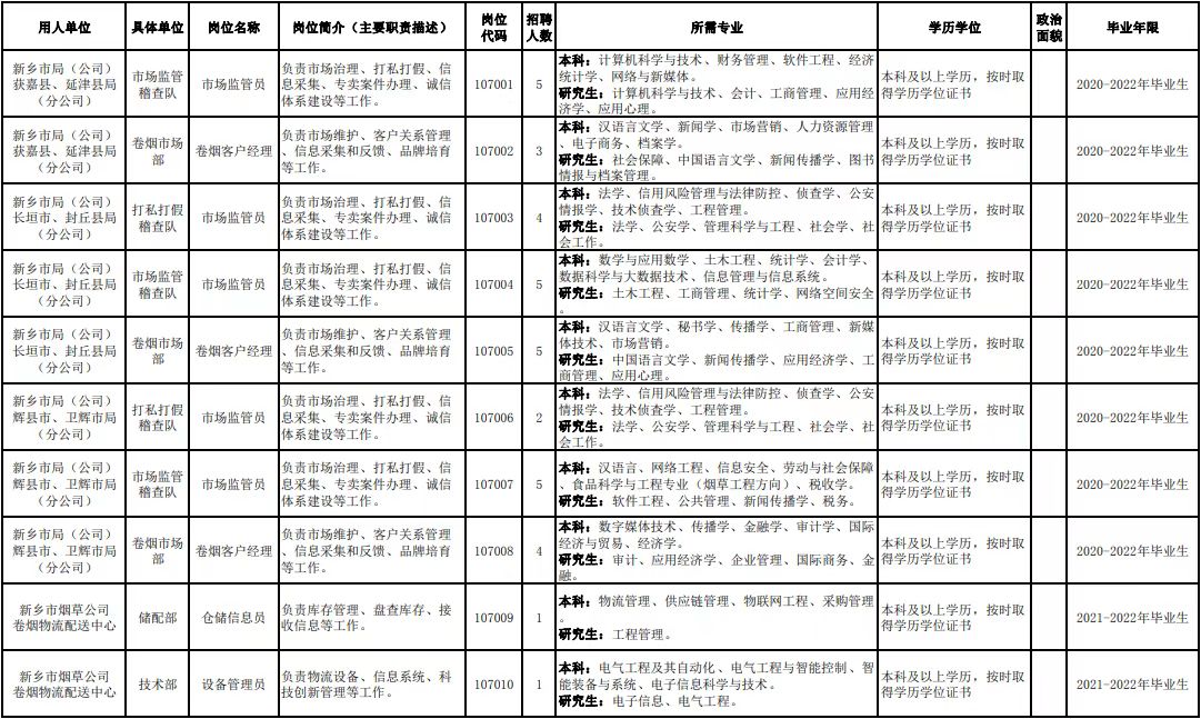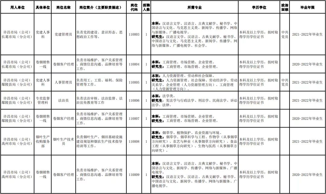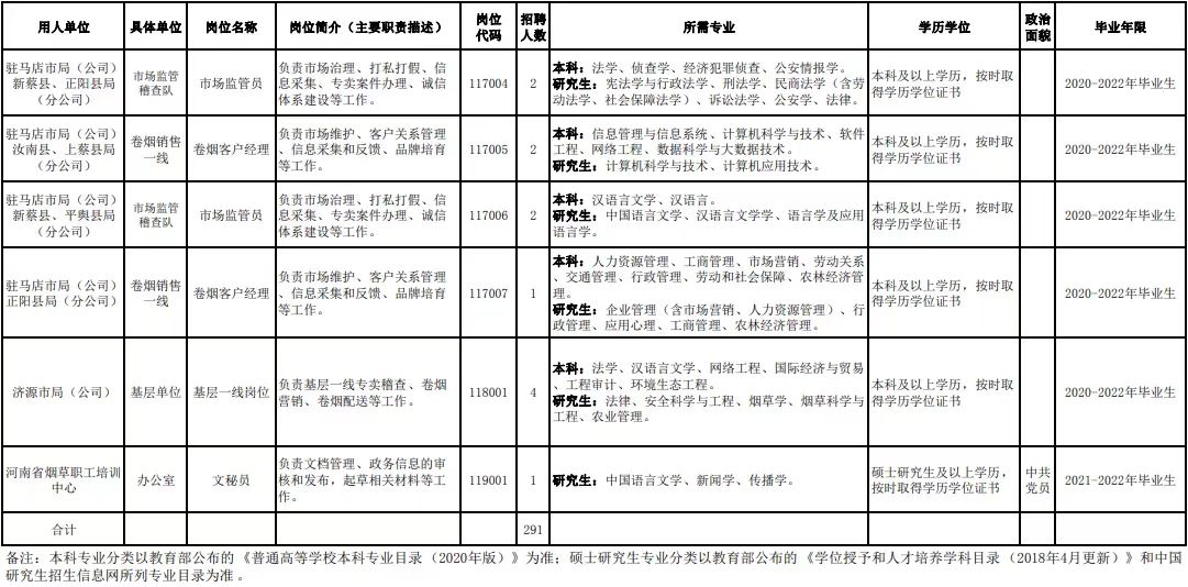 附件1.河南省烟草专卖局(公司)2022年高校毕业生招聘岗位明细表