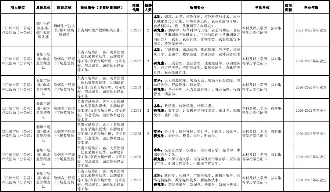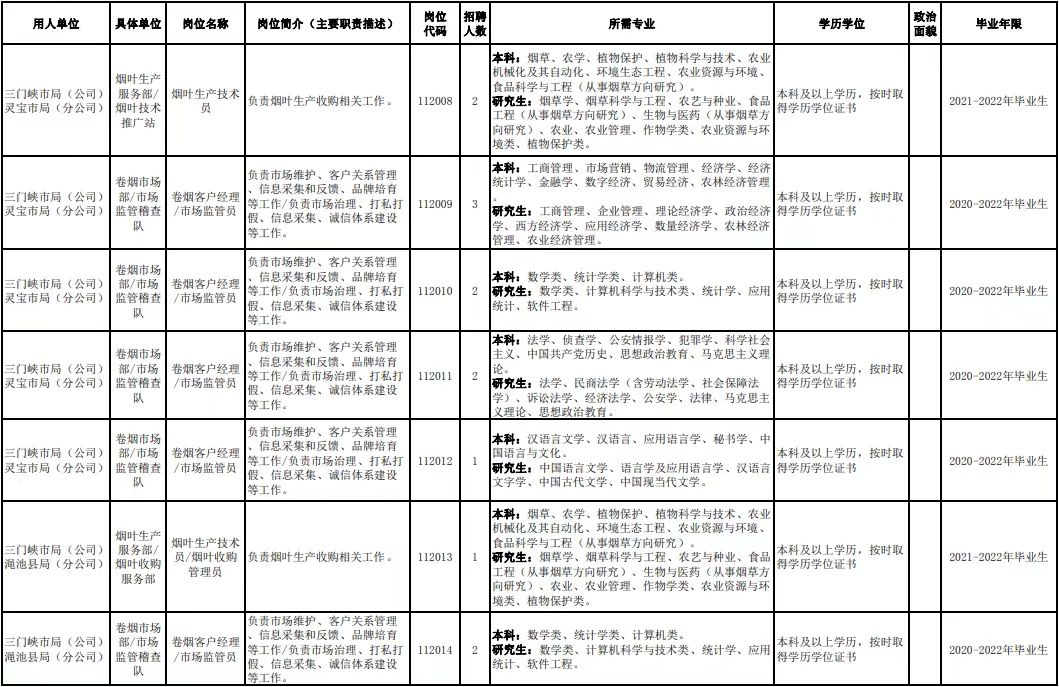 3.符合招聘岗位的学历、专业、毕业年限等要求。国家计划内招收的普通高校毕业生应在当年7月31日前取得毕业证、学位证和报到证;国(境)外高等公司毕业生,应在上年8月1日至当年7月31日之间取得学历学位证书和相关认证材料。就业手续齐全;