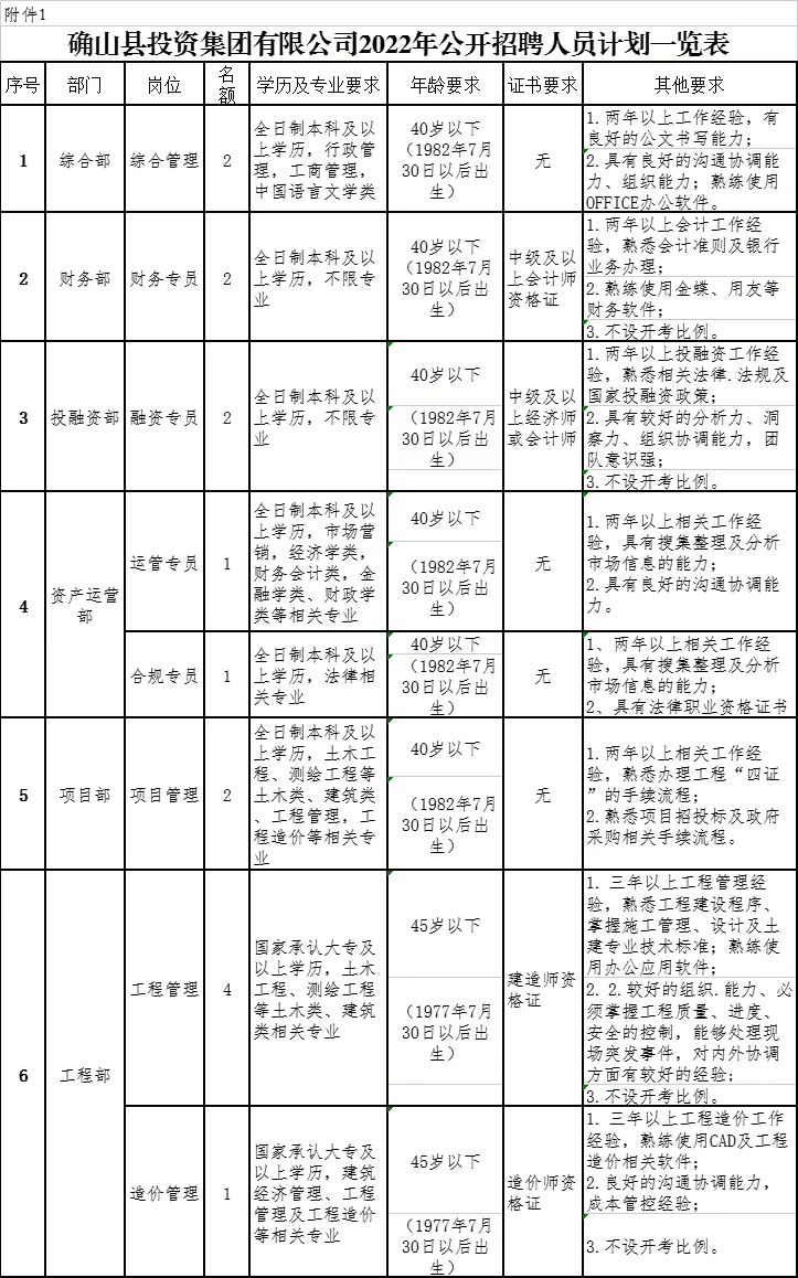 附件1确山县投资集团有限公司2022年公开招聘人员计划一览表.doc