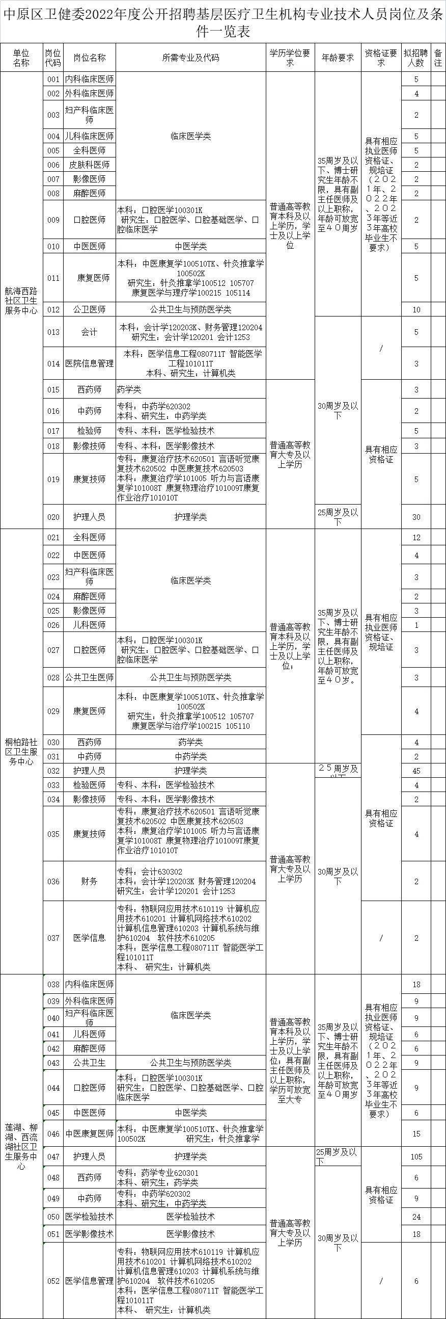 附件:《中原区卫健委2022年度公开招聘基层医疗卫生机构专业技术人员岗位及条件一览表》