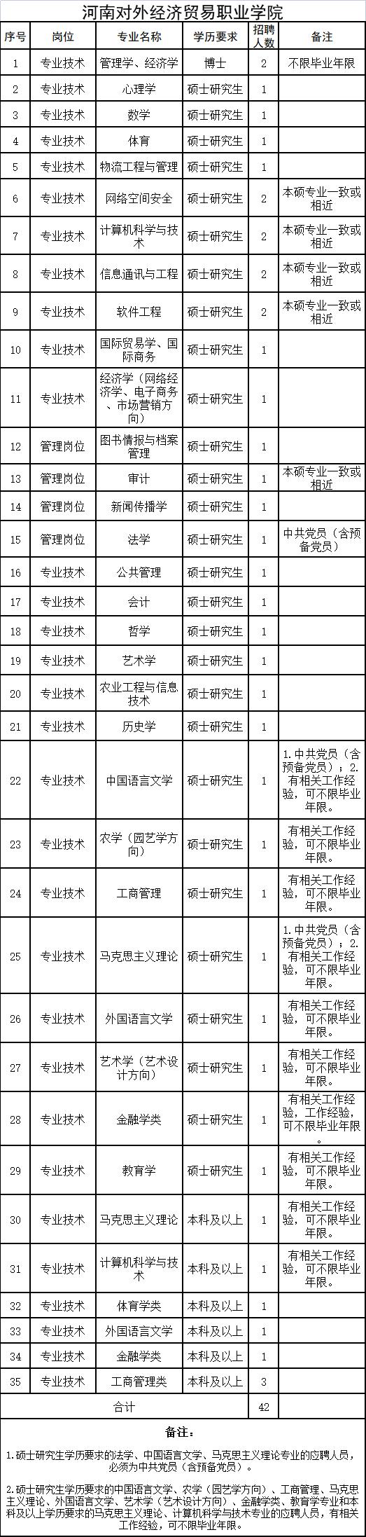 根据公司发展需要,招聘工作人员42名,具体专业、人数等详见附件《河南对外经济贸易职业公司2022年公开招聘工作人员一览表》。