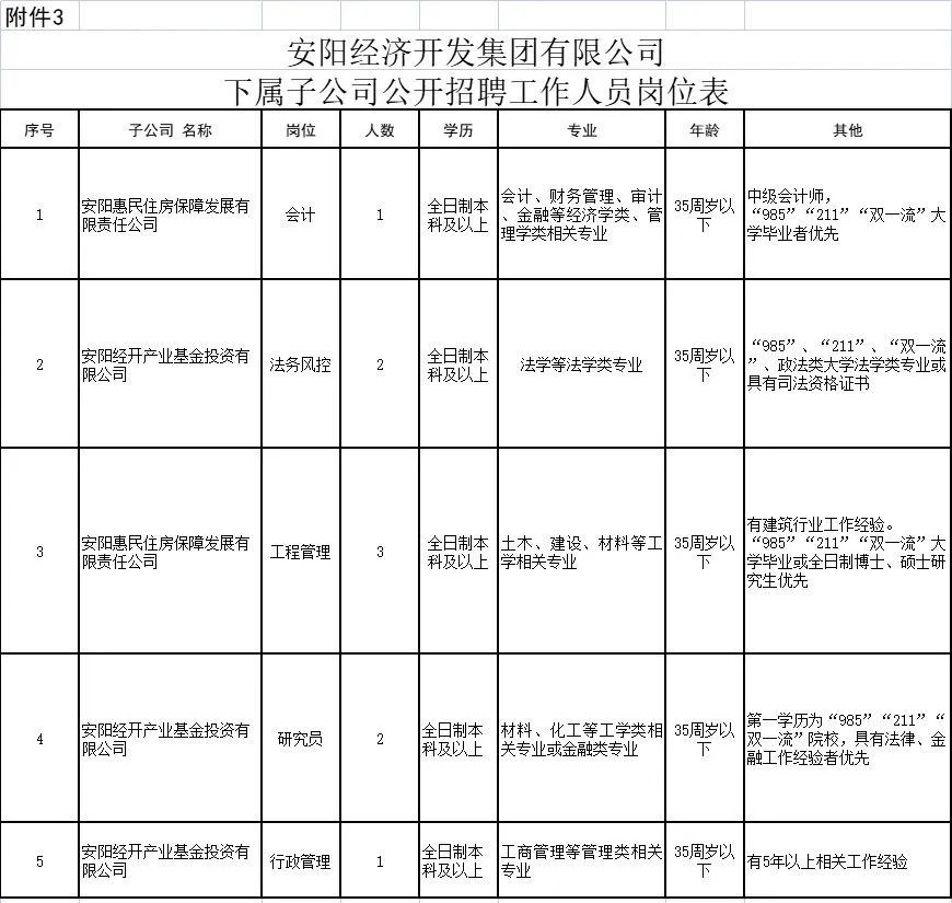 3.公开招聘9人。具体岗位要求详见《安阳经济开发集团有限公司下属子公司公开招聘工作人员岗位表》(附件3)。
