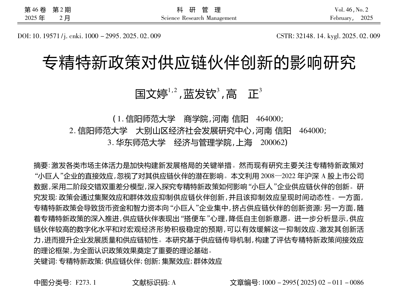 近日,伟德国际victor1946国文婷博士在管理学权威期刊《科研管理》2025年第2期上发表题为“专精特新政策对供应链伙伴创新的影响研究”学术论文。《科研管理》为国家自然科学基金委员会管理科学部认定的管理科学A级重要期刊,被五大检索库(CSSCI,北大核心,JST,CSCD,AMI核心)同时收录,为公司认定的一级权威期刊。