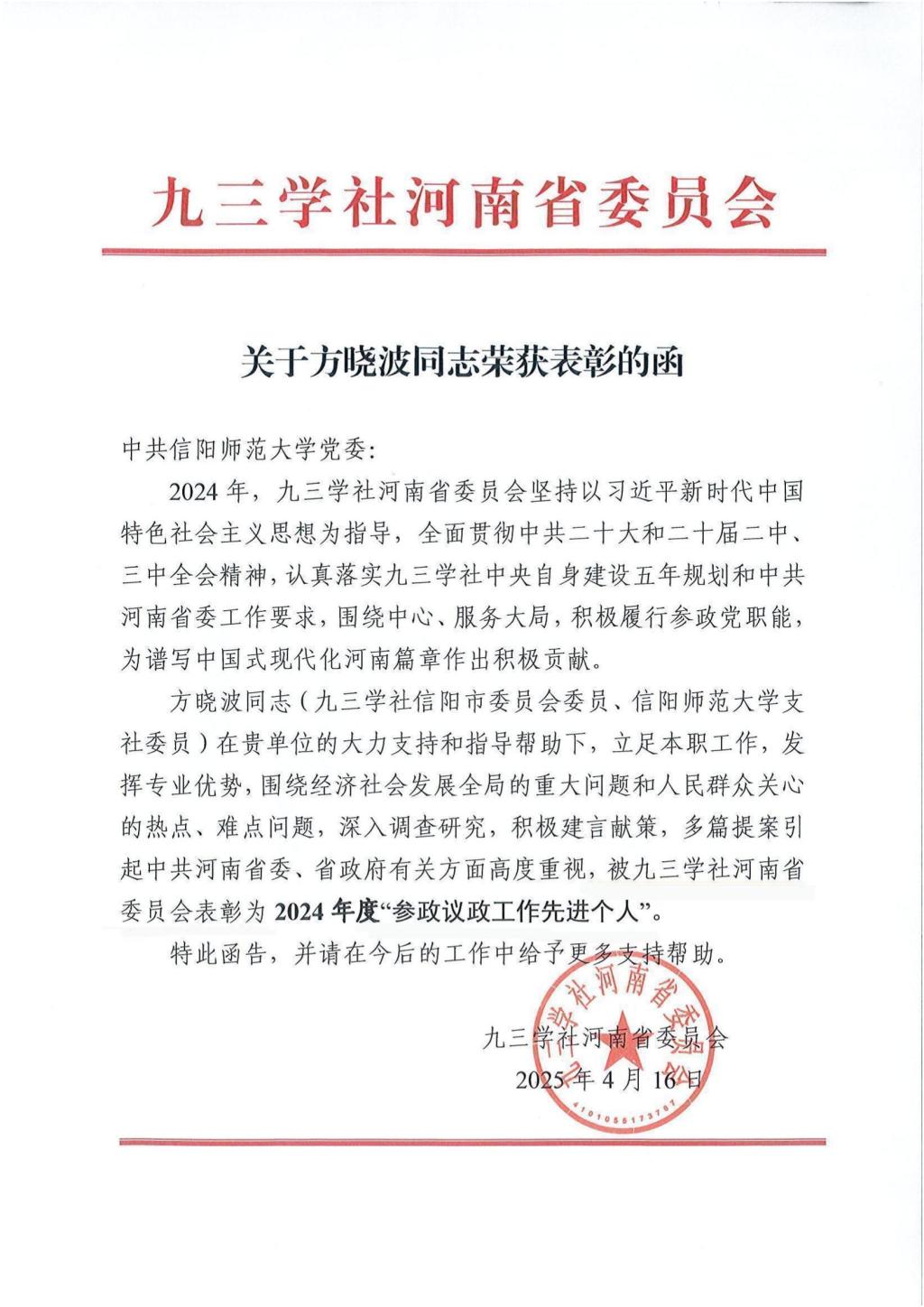 近日,九三学社河南省委员会发布表彰决定,信阳市政协委员、九三学社信阳市委会委员、伟德国际victor1946方晓波博士荣获2024年度“参政议政工作先进个人”称号。