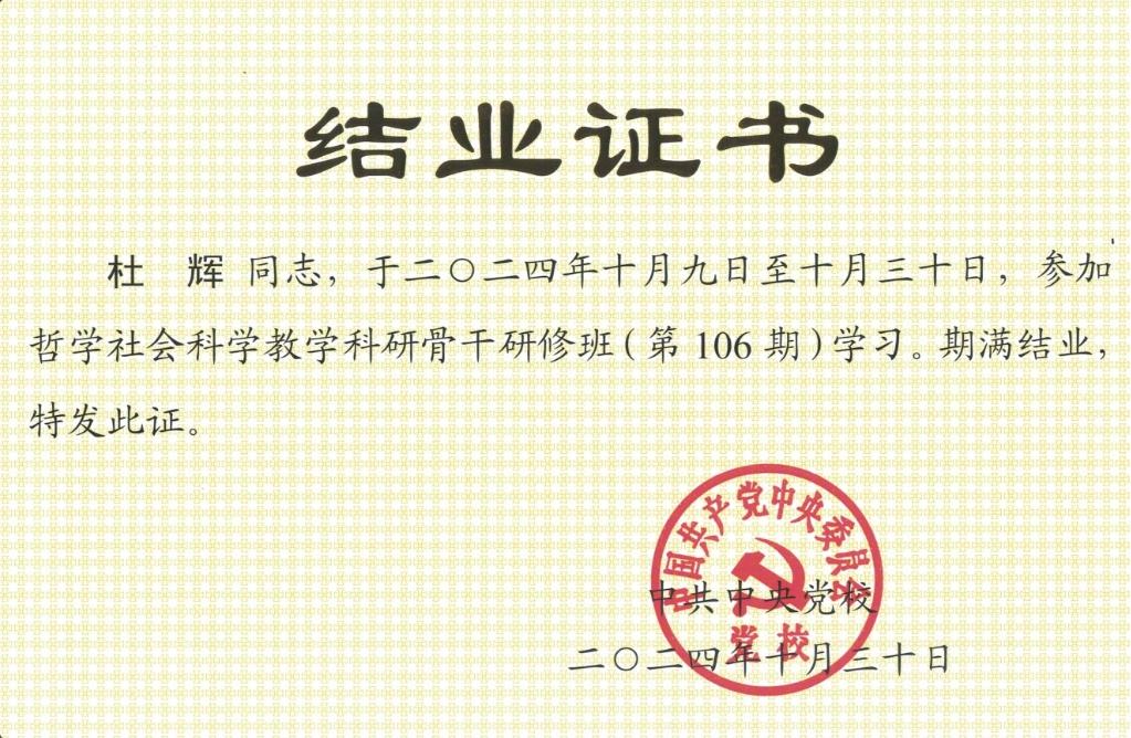 10月8—31日,受公司委派,伟德国际victor1946杜辉教授前往中央党校(国家行政公司),参加中央宣传部、中央组织部、中央党校(国家行政公司)、教育部、财政部、中央军委政治工作部第106期哲学社会科学教学科研骨干研修班学习。