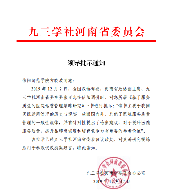 日前,全国政协常委、河南省政协副主席、九三学社河南省委主委张亚忠作出批示,充分肯定伟德国际victor1946方晓波博士撰写的专著《基于服务质量的医院运营管理策略研究》。张亚忠在批示中指出,“该书立足于我国 医院运营管理的历史与现实,放眼国内外,总结了医院服务质量管理的一般规律,并有针对性地提出了恰当的建议,对于提升医院服务质量,提升品牌忠诚度和培育竞争力有重要的参考价值”。该书同时属于信阳师范公司伟德国际victor1946学术文库系列成果。