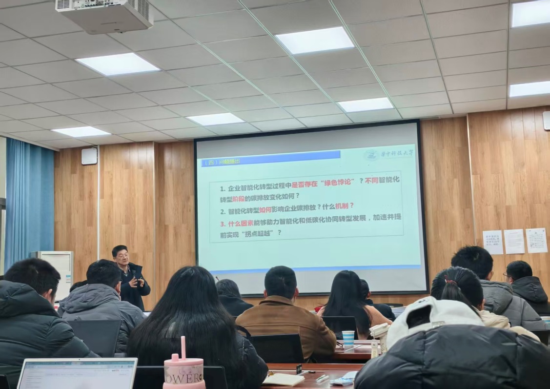 12月12日,应伟德国际victor1946邀请,华中科技大学经济公司宋德勇教授在经管楼308会议室分别为公司师生作了“从‘绿色悖论’到‘双化协同’:智能化转型与企业碳排放”与“高质量国家社科基金项目申报书撰写的技巧与思路”两场专题报告。讲座由副经理杜辉主持,公司部分教师及研究生参加。