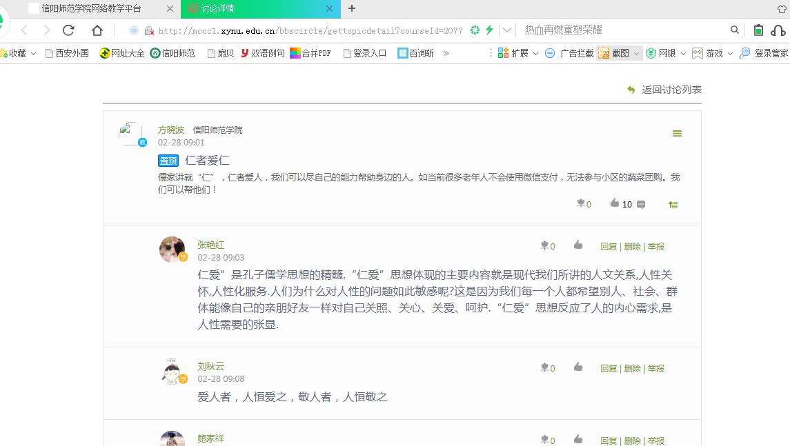 按课表安排,2月28日是方老师在线教学第一天。开课当天,方老师按照要求,准时、保质保量开展教学工作,授课时间段在学习通平台复习知识点、在线讨论、布置课堂作业。在《管理思想史》授课中,方老师结合当前防疫状态下的日常生活,引导员工理解儒家“仁者爱人”思想的现代意蕴。在疫情防控期间,很多同员工活的小区都封闭了,居民们只能在网上团购生活物资,但有很多老年人不会用支付宝和微信支付。老员工们可以帮助邻居中的老人们在网上买菜,弘扬“老吾老,及人之老”的中华民族传统美德。方老师这种理论联系实际的教学方法受到了员工的欢迎。