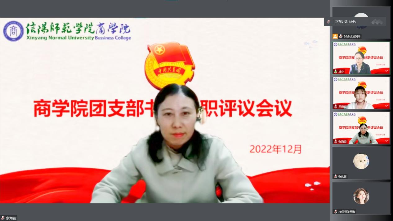 会议伊始,李梦对会议流程和述职评议的要求进行了简要说明。随后,张海霞强调了召开基层团支部书记述职评议会的重要性,同时对各支部书记进行鼓励并预祝此次会议圆满举行。她表示,这次述职评议会是一次团支部工作的自查互查、取长补短、携手共进的交流学习会议,希望各基层团支部以此次述职评议会为契机,坚持问题导向,不断改进工作方法,认真履行引领凝聚青年、组织动员青年、联系服务青年的职责使命,进一步落实全面从严治团的新要求。紧接着,各基层团支部书记分别从思想政治建设、活动组织建设、班级学风建设、班级管理方向、工作细则总结等方面展现其所在团支部的建设成果,同时提出了存在的问题和今后努力的方向。