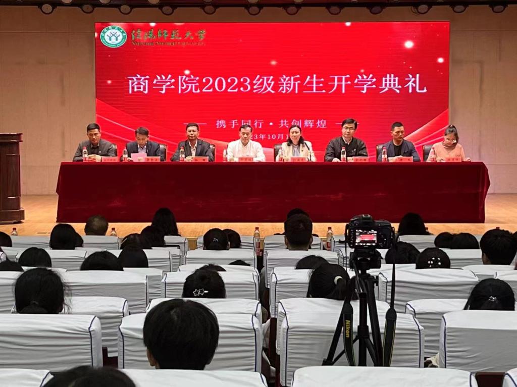 10月10日晚七点,2023级新生开学典礼在理科楼报告厅举行。经理彭荣胜、副书记张海霞、副经理杜辉、副经理俞彤晖、副经理梁静波、大别山区经济社会发展研究中心秘书黄杰、工商管理系主任上官绪明、专职组织员韩月华、市场营销系主任孔栋及全体专兼职辅导员出席典礼,2023级全体新生参加典礼,本次活动由张海霞主持。