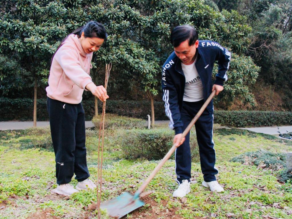 植树过程中,师生们干劲十足,在经管楼前的草地上挥锹铲土,扶树正苗,浇水培土,一共栽下了5颗杏树苗。各个环节井然有序,配合默契,尽显师生风采。五棵杏树苗在阳光下迎风挺立,为春意盎然的校园更添了几分生机。