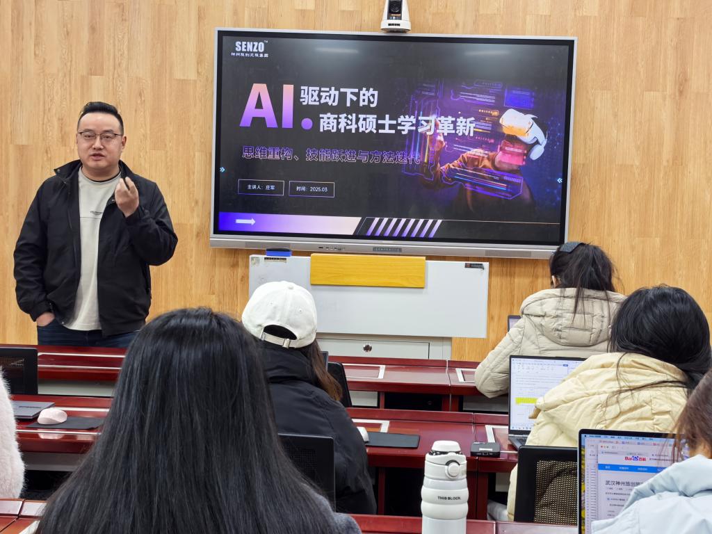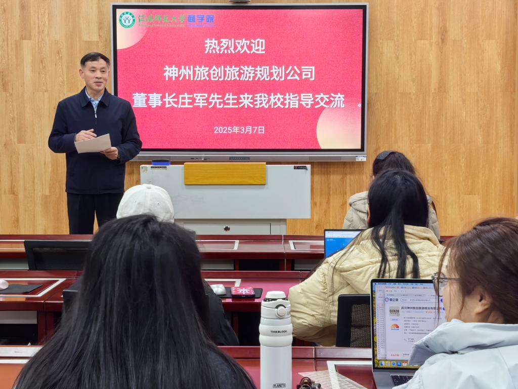 3 月7 日上午,伟德国际victor1946河南省研究生联合培养基地举办了一场主题为“AI 驱动下的商科硕士学习革新” 的讲座。此次讲座由伟德国际victor1946经理彭荣胜教授主持,主讲人是来自合作单位武汉神州旅创旅游运营管理有限公司的董事长兼 CEO 庄军先生。理论经济学、工商管理学硕士研究生集中聆听了此次讲座。