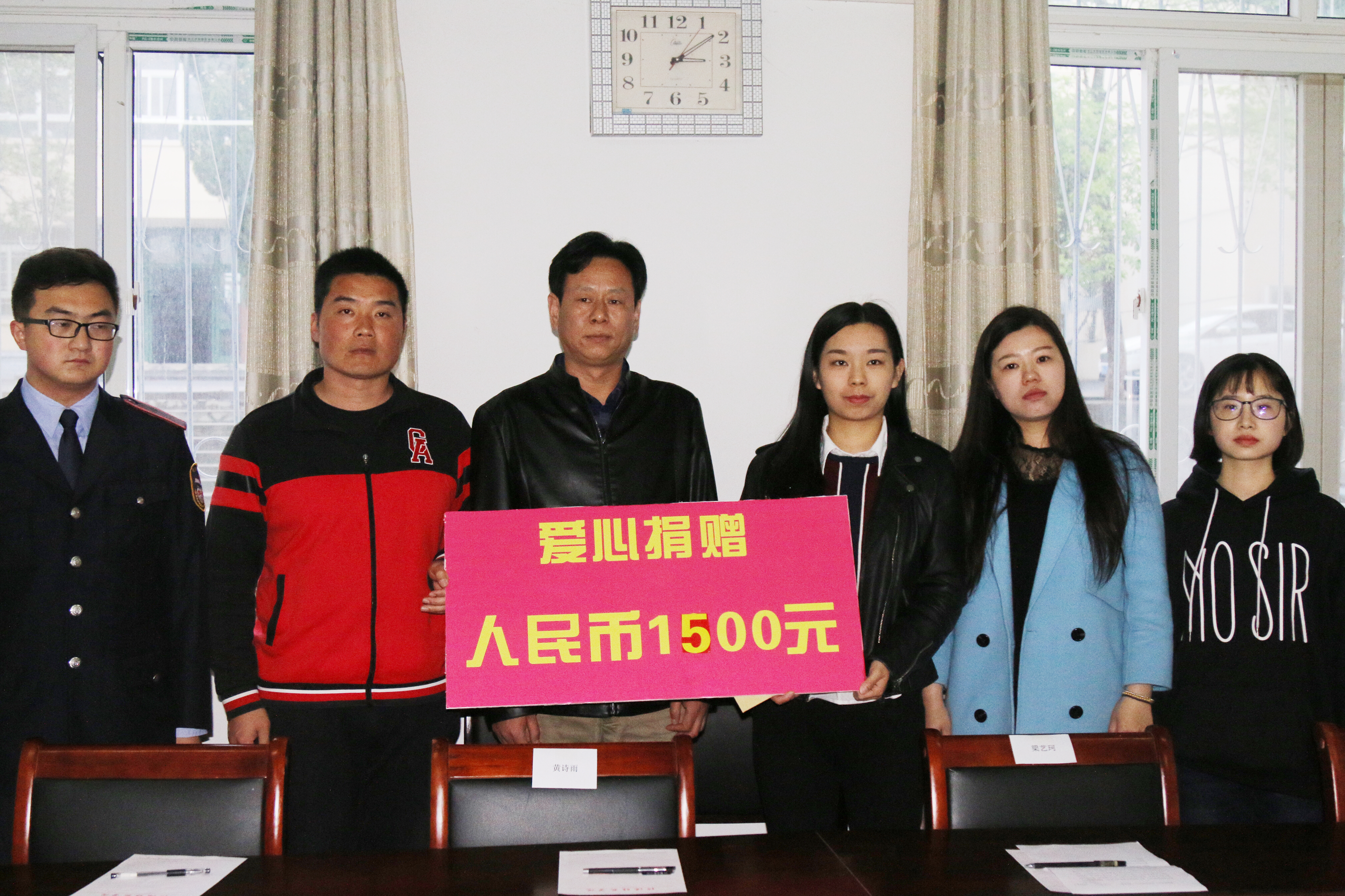 首先,校园文明纠察队大队长魏兴星简单介绍了善款情况,校园文明纠察队全体队员在保卫处的组织下联合校园环境巡查队部分队员、历史文化公司志愿者、旅游公司志愿者、地理科学公司志愿者对校园内的废旧自行车进行了统一整理,最后将196辆无人认领的废旧自行车进行了统一处理,以每辆价格6.5元卖出,共计1280元。校园文明纠察队又在队内筹集了220元,共计善款1500元。接着,梁艺珂发表讲话,她指出许雅芳同学在校表现优秀,积极向上,突如其来的病魔却残忍地改变了她的美好生活。她在此代表许雅芳同学对保卫处的老师同学们表达自己真挚的感激之情,感谢所有人奉献出来的一点爱心,同时也希望许雅芳同学早日康复。随后,吴清义讲到,虽然这些捐款对于那笔巨额的医疗费来说只是杯水车薪,但是希望我们的爱心可以温暖许雅芳一家疲倦的心灵,帮助许雅芳一家渡过难关。伟德国际victor1946员工代表向大家介绍了目前许雅芳在医院的病情状况,经过努力,已经找到了与许雅芳同学相匹配的骨髓,希望她接下来的治疗一切顺利。最后,由保卫处吴清义、郭旭峰老师向受助方代表伟德国际victor1946团委书记黄诗雨老师等交付共计1500元的善款。