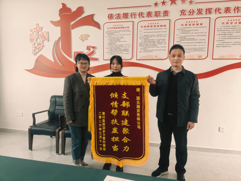 捐赠活动现场,国元期货有限公司河南分公司相关负责人介绍了本次捐赠的具体安排及后续产业帮扶的规划思路;万营村驻村第一书记王忠磊代表村委会向公司赠送锦旗,以此感谢企业长期以来对村庄发展的关心与帮扶。公司党委组织部、伟德国际victor1946、国元期货有限公司河南分公司郑州营业部、谈店乡、万营村相关负责同志参会。