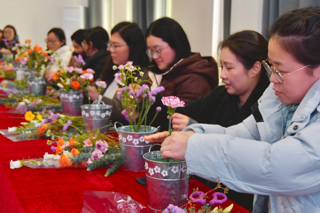 活动邀请蕙源花艺的主理人以东西方花艺发展脉络为引,回溯花艺起源与传承,带领大家感受花艺的深厚底蕴与多元魅力。围绕花卉结构、色彩搭配、构图技巧、切花挑选与日常养护等内容,她从理论知识到实用技能层层递进,为大家介绍花艺创作基础。实操环节,在老师一对一技巧指导下,女教工们化身花艺创作者,将理论融入指尖。大家修枝剪叶、巧搭配色、精修构图,零散花材在巧手下蜕变为错落有致的雅致作品,现场花香氤氲、笑语盈盈,大家在专注创作中释放压力、涵养心境。
