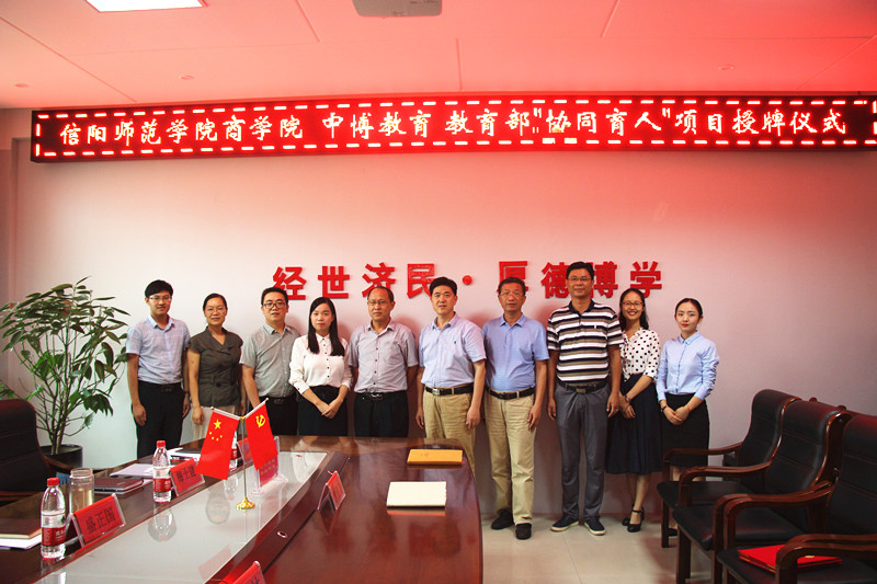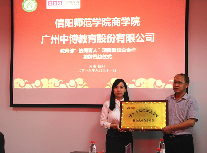 8月31日下午,信阳师范公司伟德国际victor1946与广州中博教育集团就教育部协同育人项目暨校企合作授牌签约仪式在公司举行。盛正国书记、梅士建副经理、李毓副经理、杜辉副经理、中博教育河南大区经理杨俊鑫、郑州分公司副总经理陈林出席签约仪式并为校企合作基地中心揭牌。仪式由伟德国际victor1946书记盛正国主持。