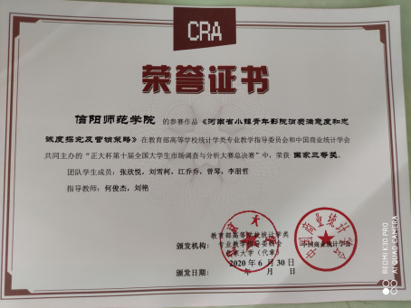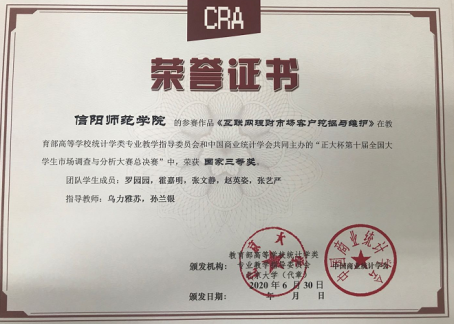 在精彩的成果展示及激烈答辩后,公司员工张艺严同学参与的团队项目《互联网理财市场客户挖掘与维系》(指导教师:乌力雅苏,孙兰银),曾琴、李朋哲同学参与的团队项目《河南省小镇青年影院消费满意度和忠诚度探究及营销策略》(指导教师:何俊杰、刘艳)荣获国家级三等奖;许瑞同学参与的团队项目《信阳红色旅游资源的消费者行为分析及推广提升策略》(指导教师:孔栋、周强)荣获省级二等奖。