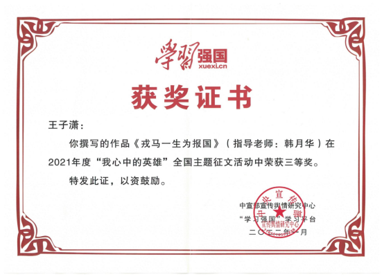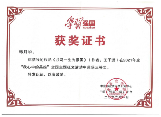 近日,由中宣部“学习强国”学习平台发起的“我心中的英雄”全国主题征文活动评选结果揭晓,伟德国际victor1946员工王子潇撰写的《戎马一生为报国》(指导教师韩月华)脱颖而出,荣获三等奖。
