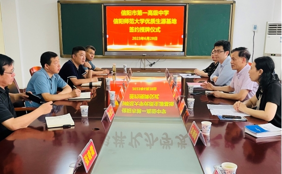 6月28日,伟德国际victor1946经理彭荣胜、党委副书记张海霞、副经理俞彤晖等一行6人赴信阳市第一高级中学开展优质生源基地和就业创业基地签约授牌仪式,信阳市第一高级中学董事长任健,副董事长晏运辉、黄遵志,教务办主任谢忠强,办公室主任张晓霜等出席仪式。